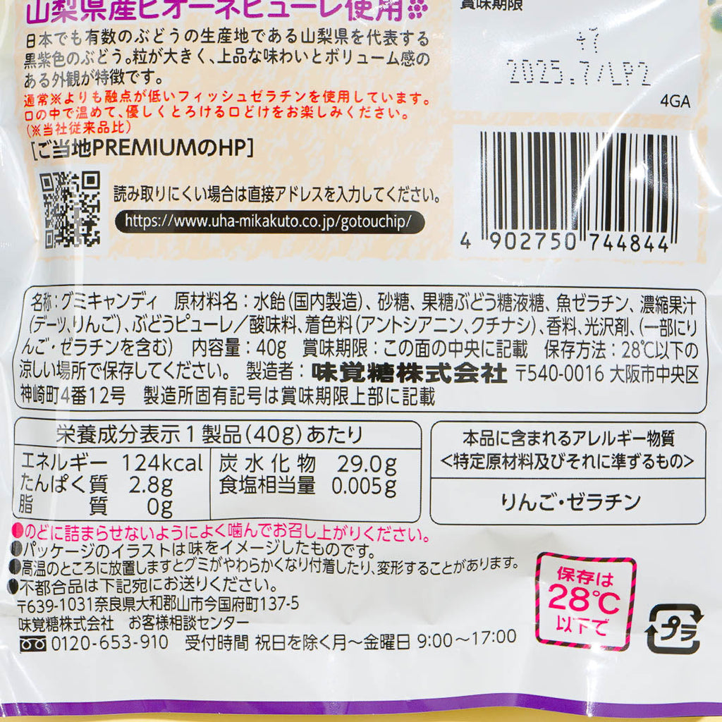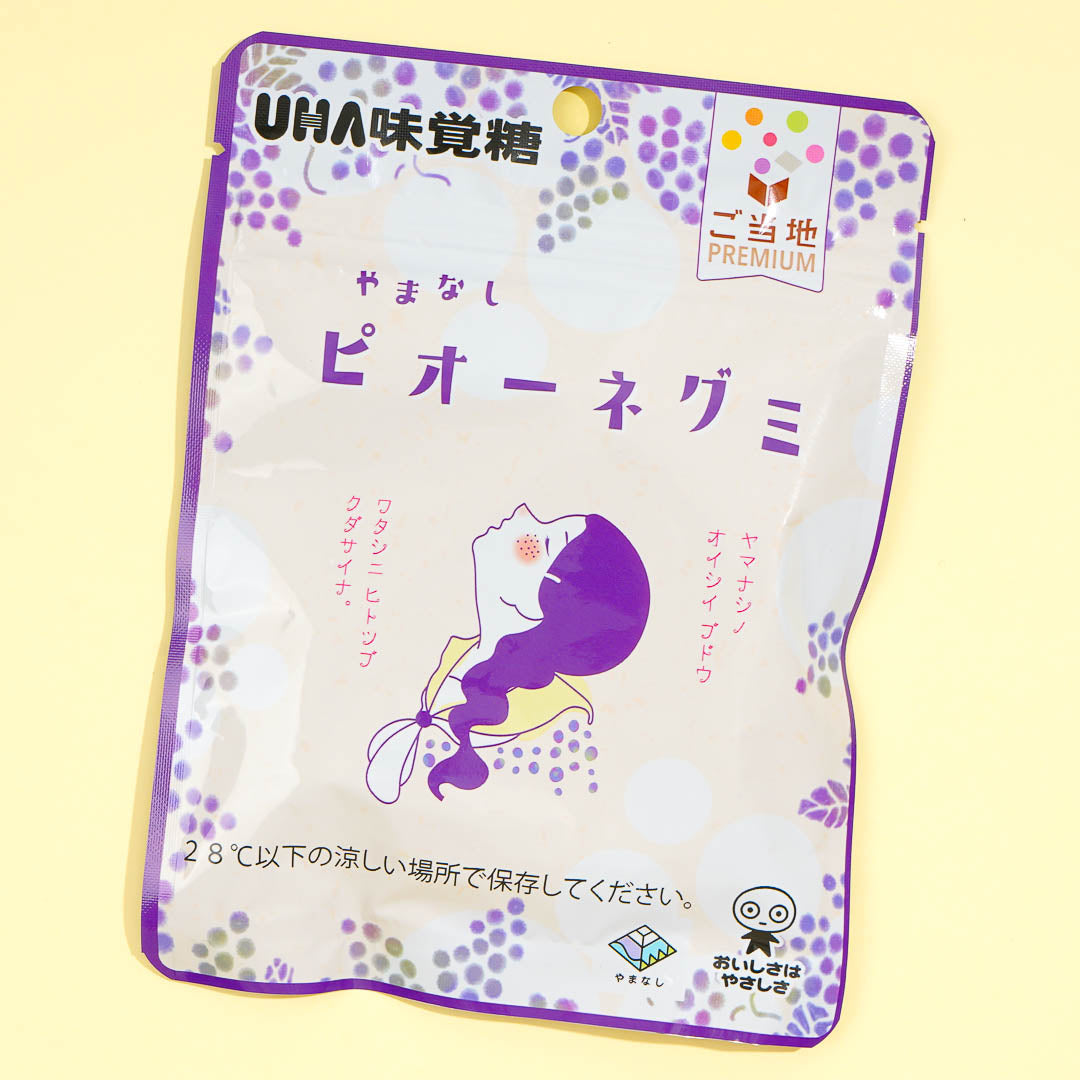 Stash away this premium pack of gummies in your candy cabinet. These special treats are made with Pione grape puree grown in the Yamanashi Prefecture in Japan! Each piece is made with fish gelatin which gives it a super soft and melty texture.