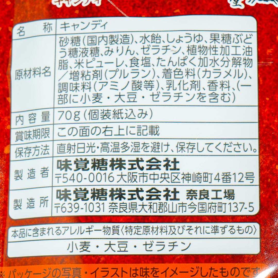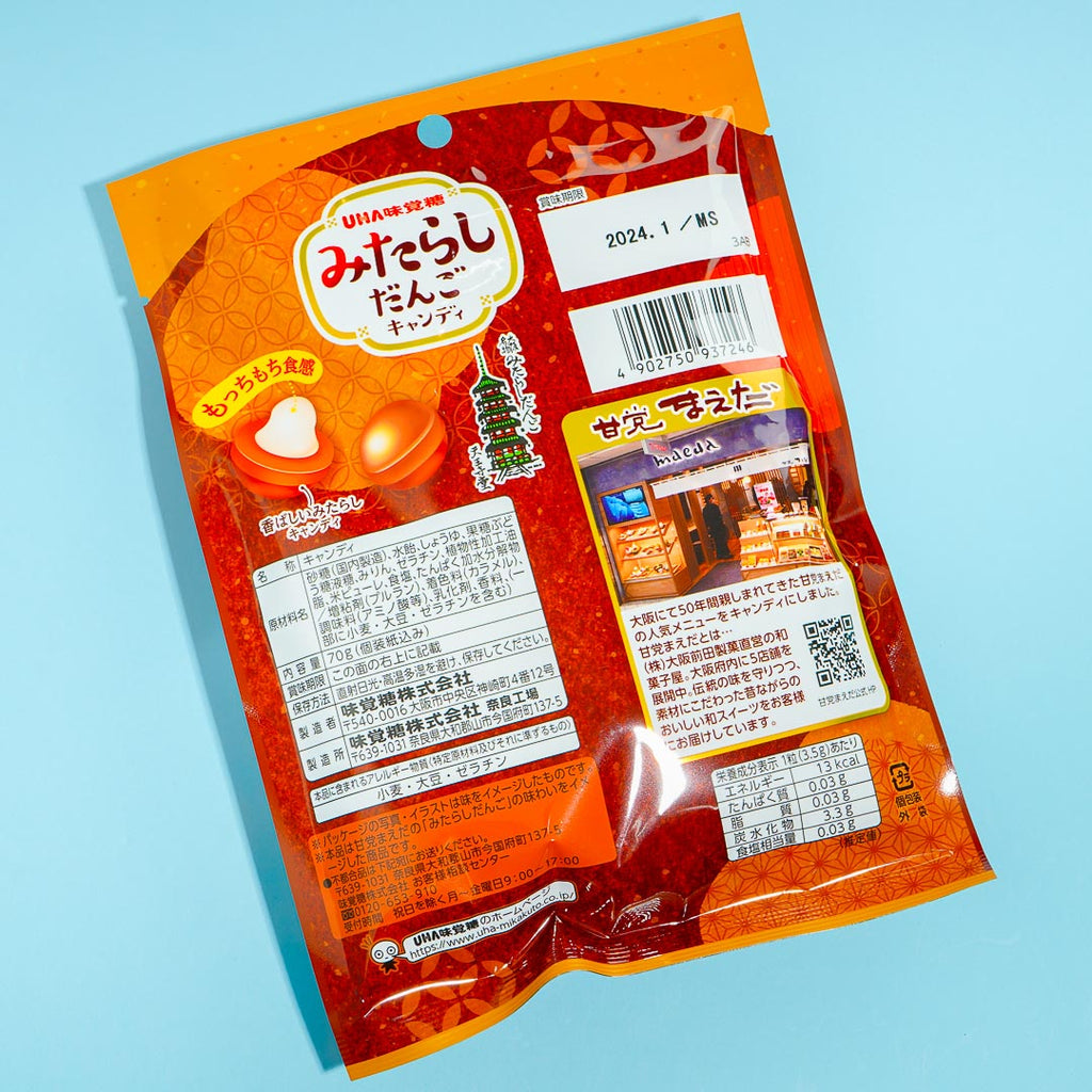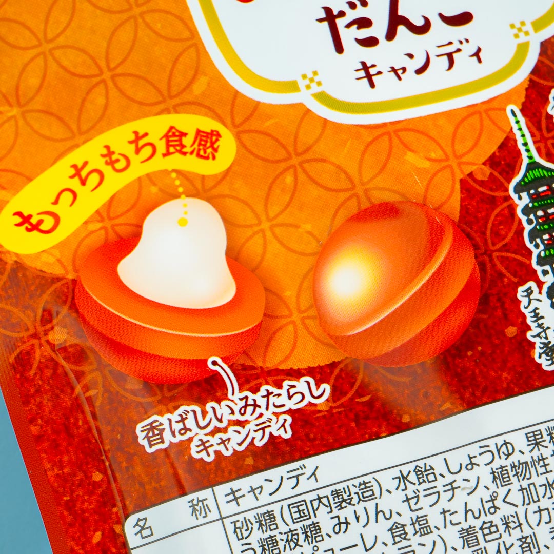 Enjoy this sweet and salty treat inspired by traditional Japanese rice dumplings with mitarashi dango or sweet soy sauce flavor. It's a hard candy with a chewy center that feels like the dumpling's texture.
