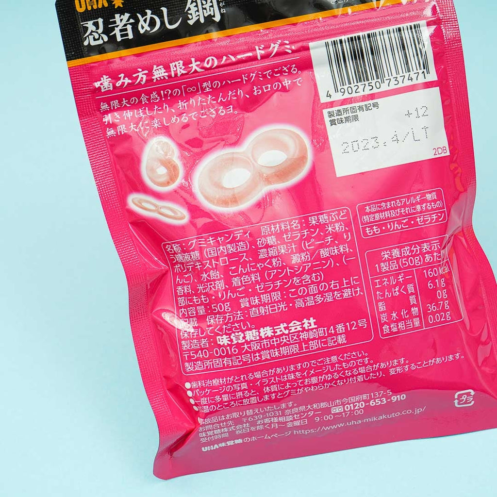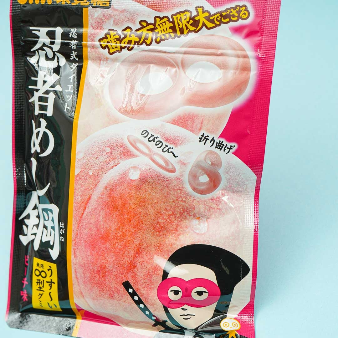 A bag of peach-flavored gummies that are shaped like ninja masks