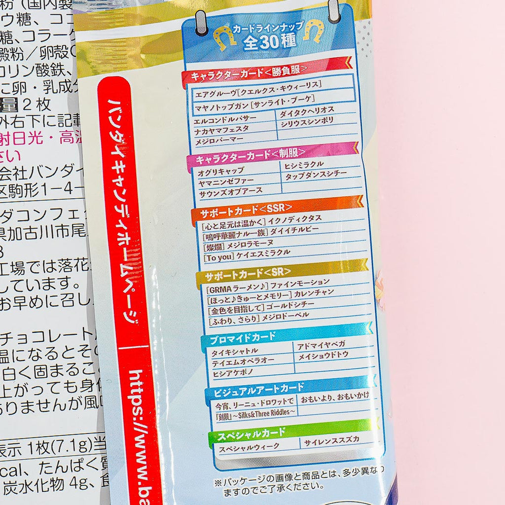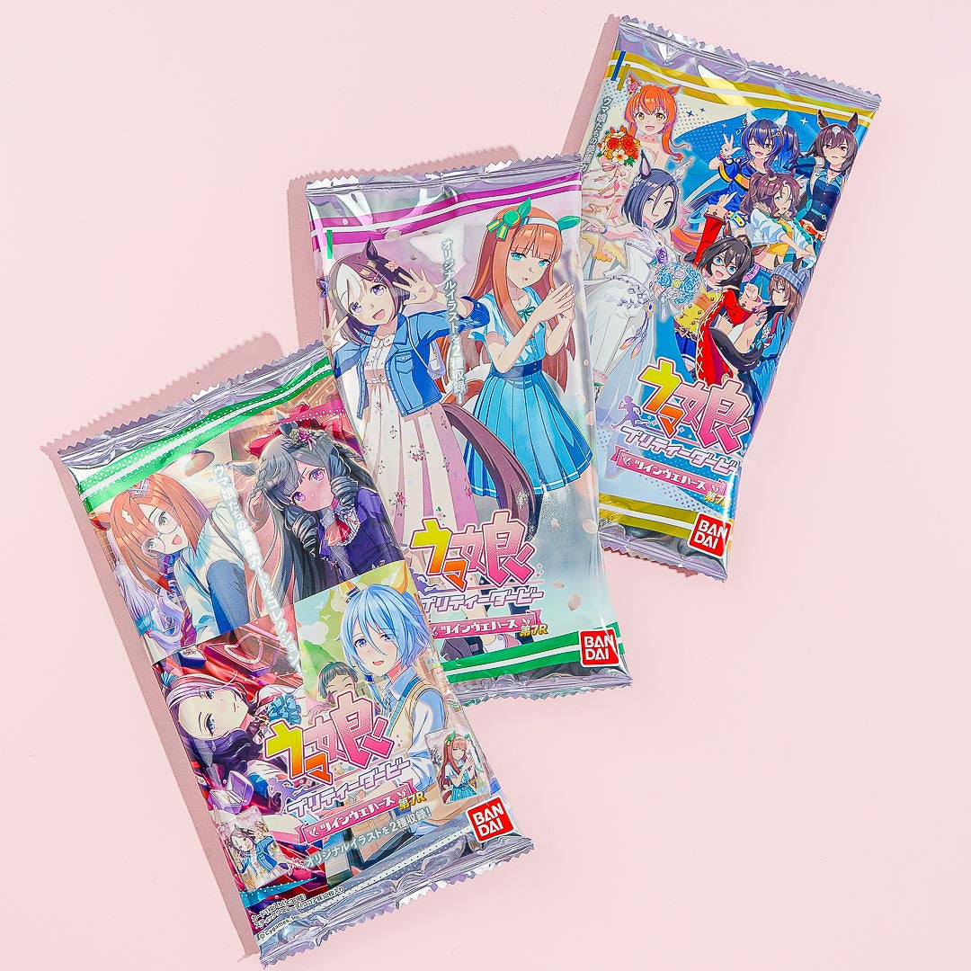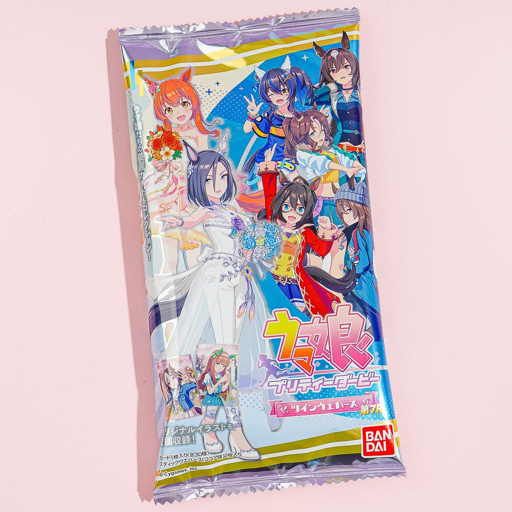 Expand your anime card collection with this special pack! It comes with two wafers and a special 7th edition card which features a random character from the mobile game and anime series about horse race girls, “Uma Musume Pretty Derby.” By ordering, you get a random metallic card out of thirty possible designs when you order!