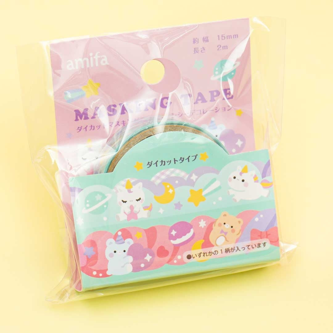 • A kawaii roll of die-cut masking tape illustrated with bears and unicorns