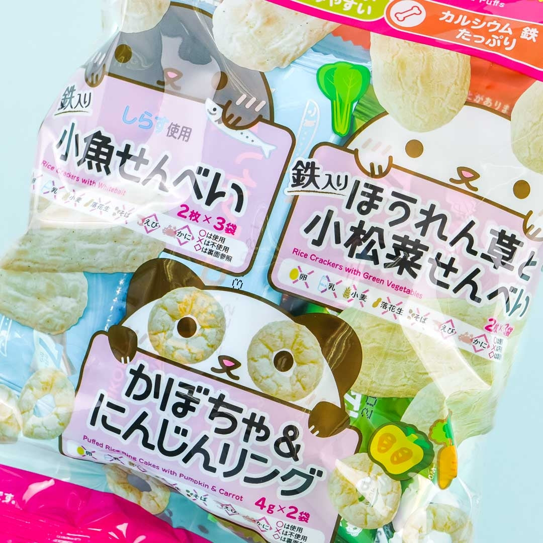 Includes: 3 x packs sardine rice crackers, 3 x packs vegetable senbei, and 2 x packs pumpkin and carrot puffed rice ring cakes