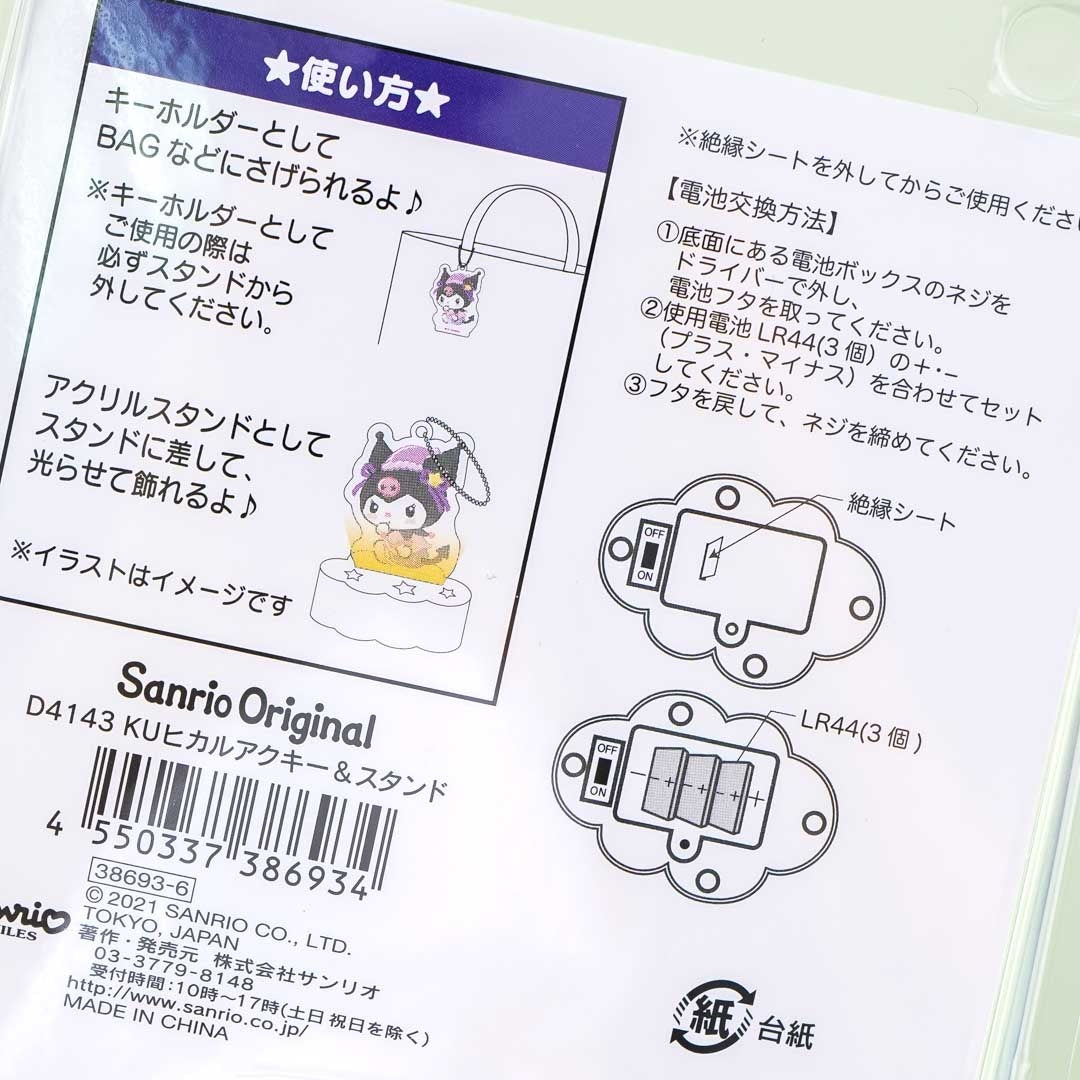 Use this cute die-cut acrylic charm of a blushing Kuromi wiggling her tail to kawaii-fy both your bag and room! It comes with a removable ball chain and a small light-up stand. The detachable base has an on-and-off switch at the bottom and runs on three LR44-size batteries.