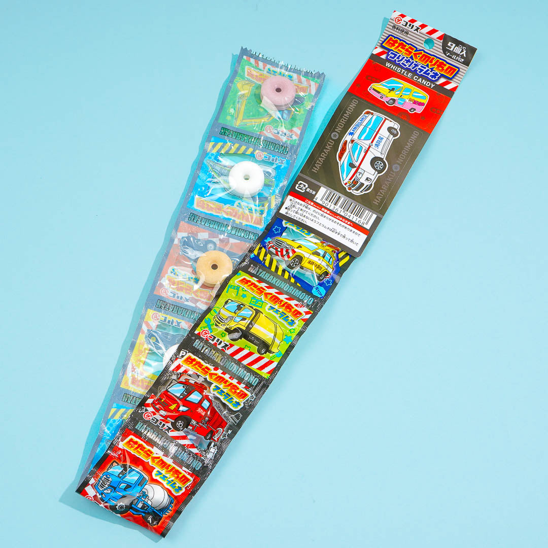 Ramune is a popular carbonated soft drink in Japan. Now you can have a taste of ramune with this set of whistling ramune candy! Each pack is illustrated with fun vehicles like police cars and fire engines. It has one whistling candy in each. Enjoy the three different flavors in the set - soda, cola, and grape.