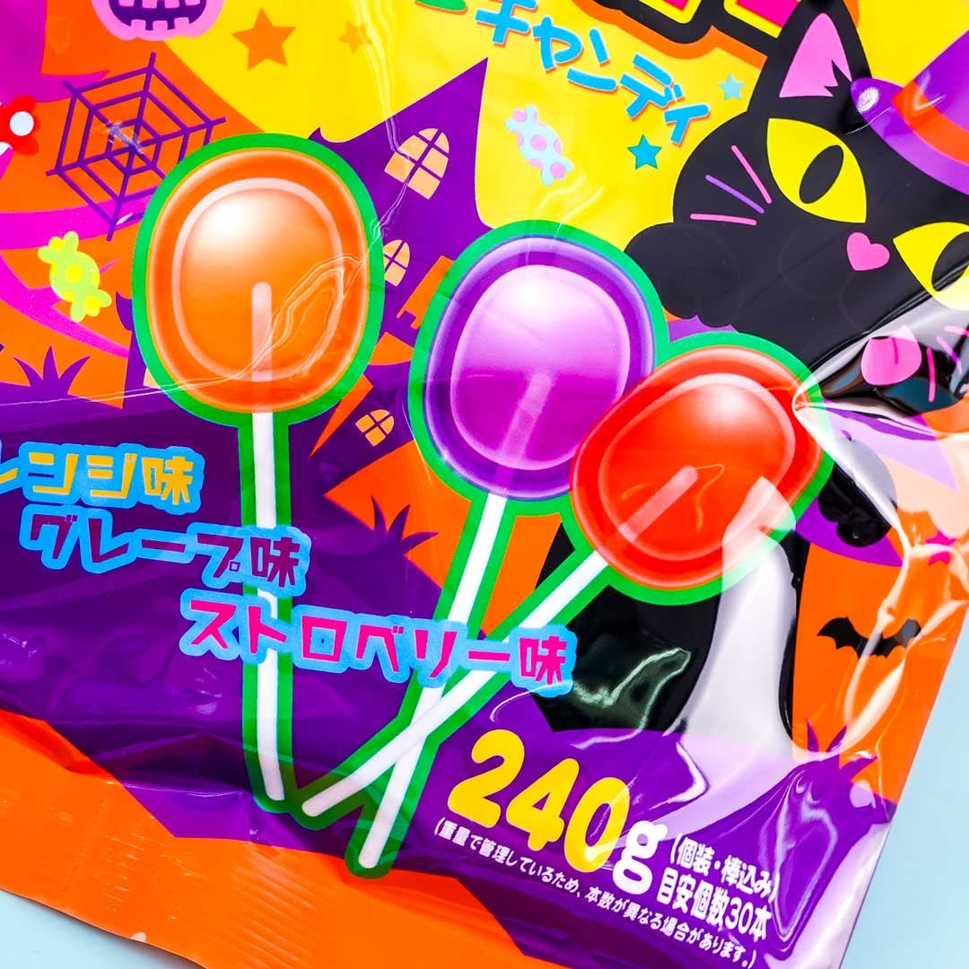 A bag of Halloween edition lollipops in orange, grape, and strawberry flavors