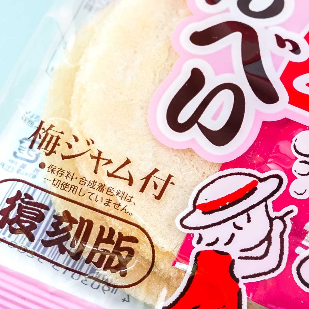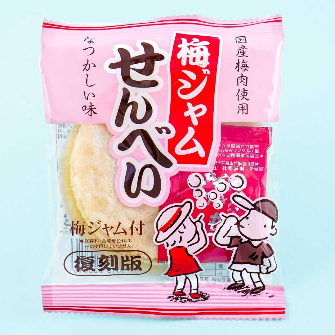 A pack of rice crackers paired with a packet of plum jam