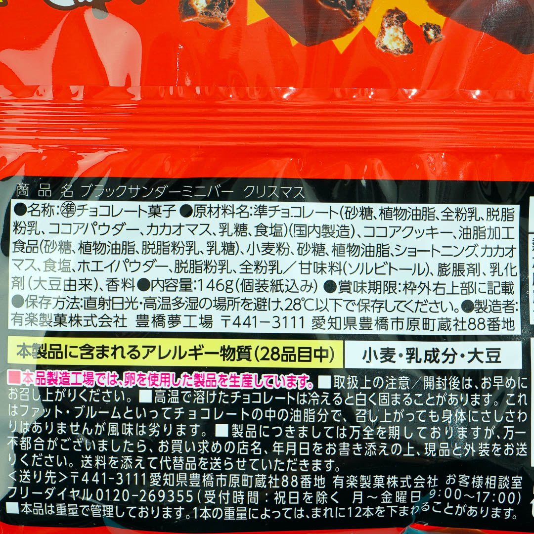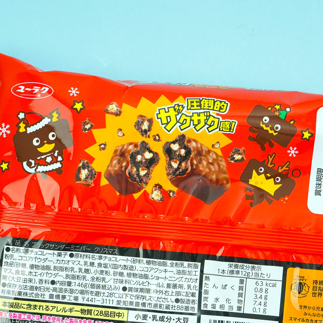 Black Thunder chocolate bar by Yuraku is a popular snack in Japan. Over 130 million of them are sold each year! The bars are a delicious combination of a crunchy cookie, Japanese rice puffs, and chocolate. This is a special edition with Christmas packaging!
